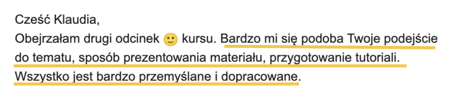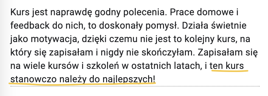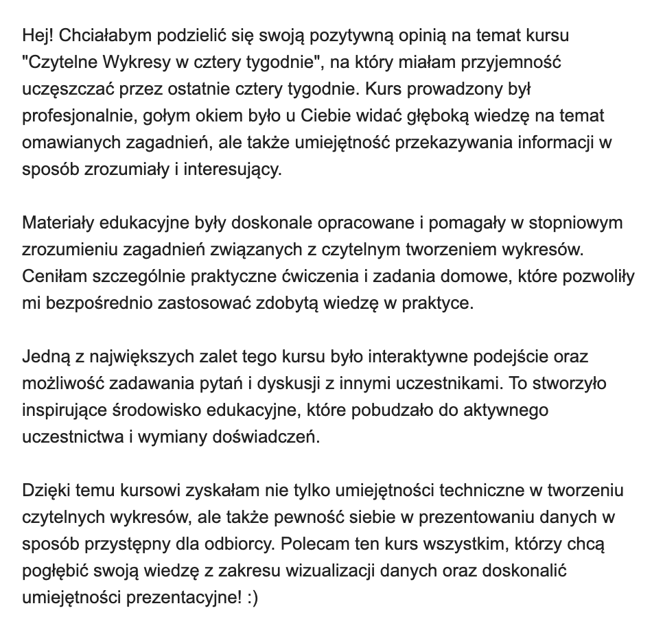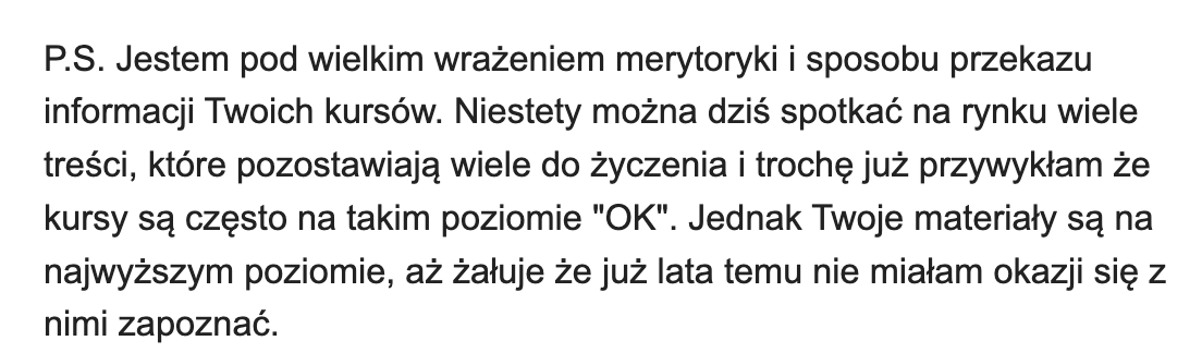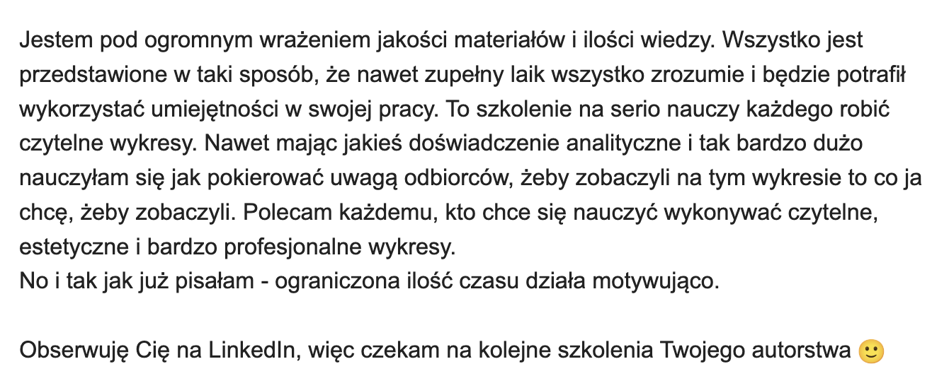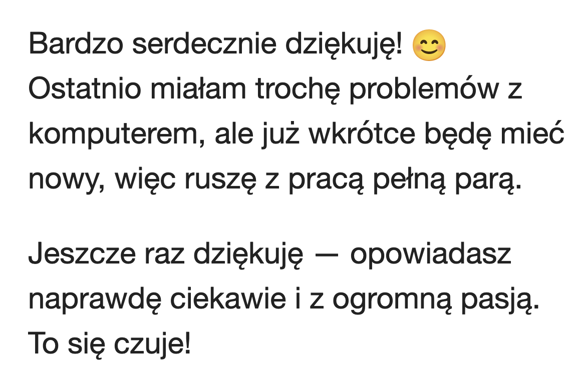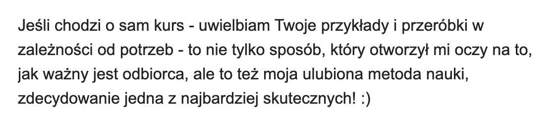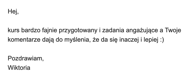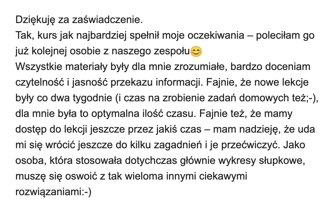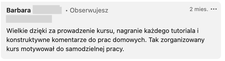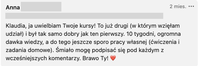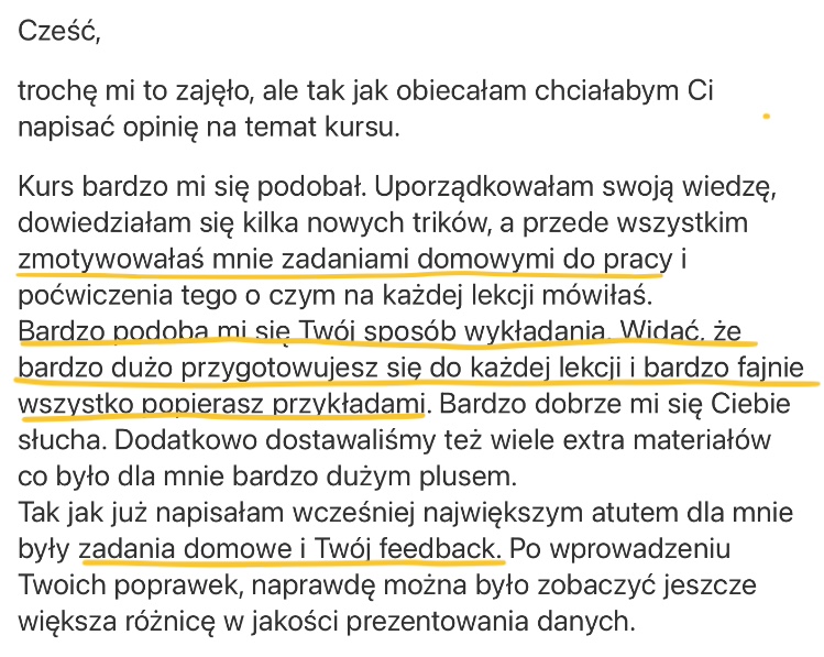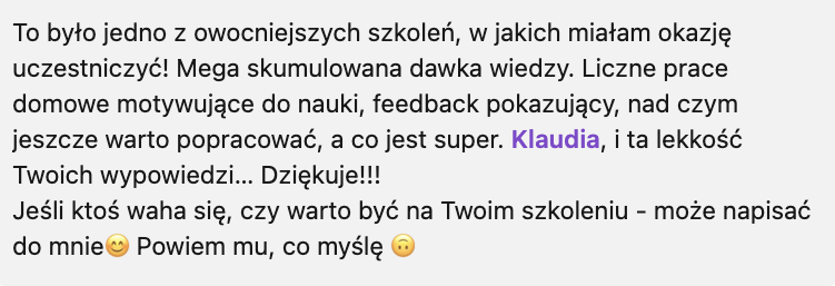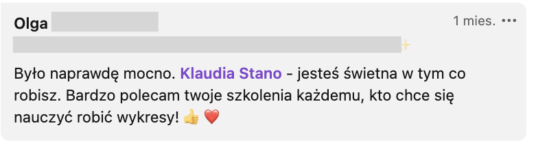 Opinie pochodzą od klientów, którzy uczestniczyli w moich kursach i szkoleniach. Opinie zbieram, weryfikuję i publikuję zgodnie z regulaminem opinii.