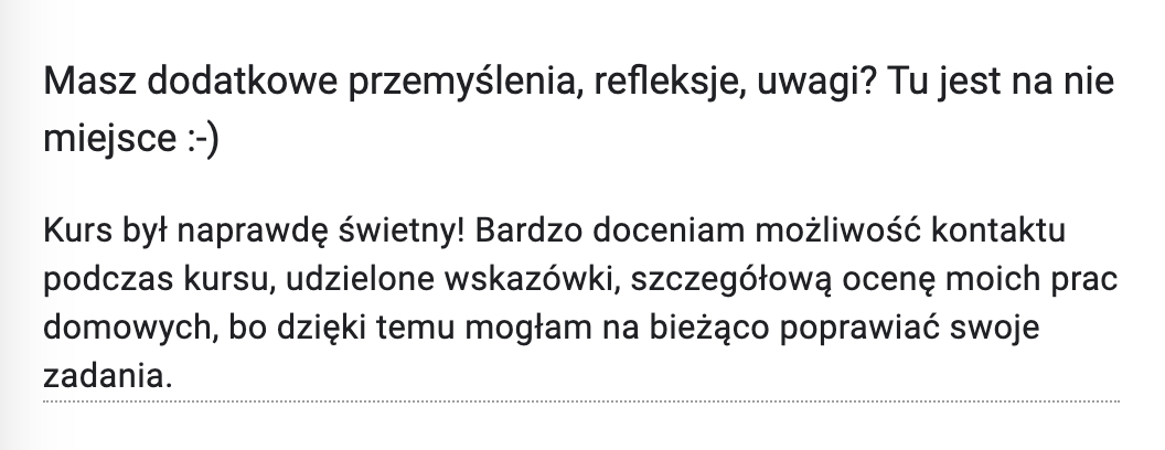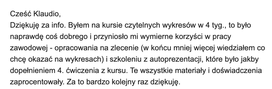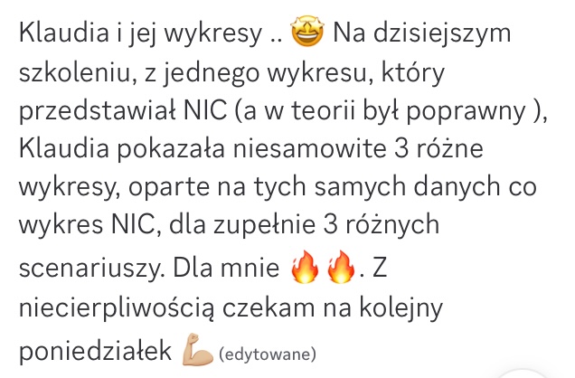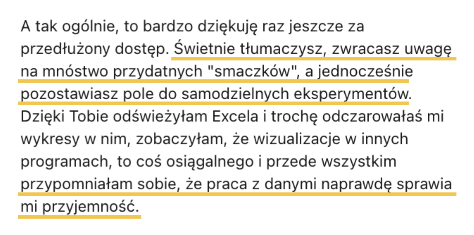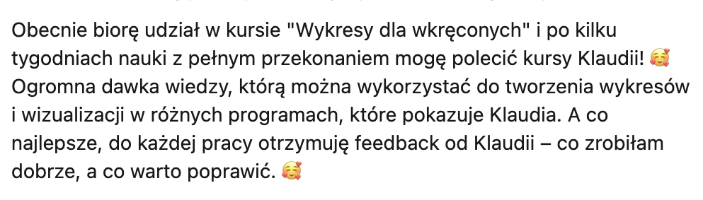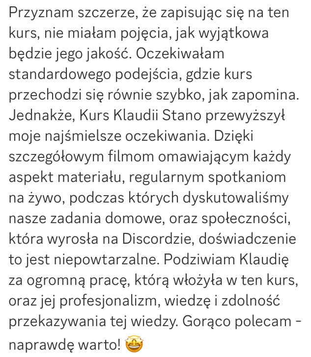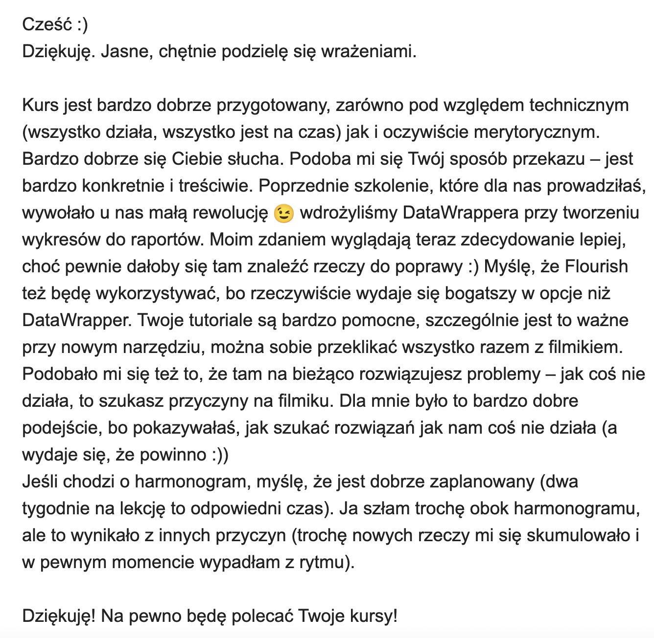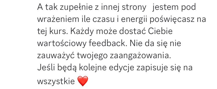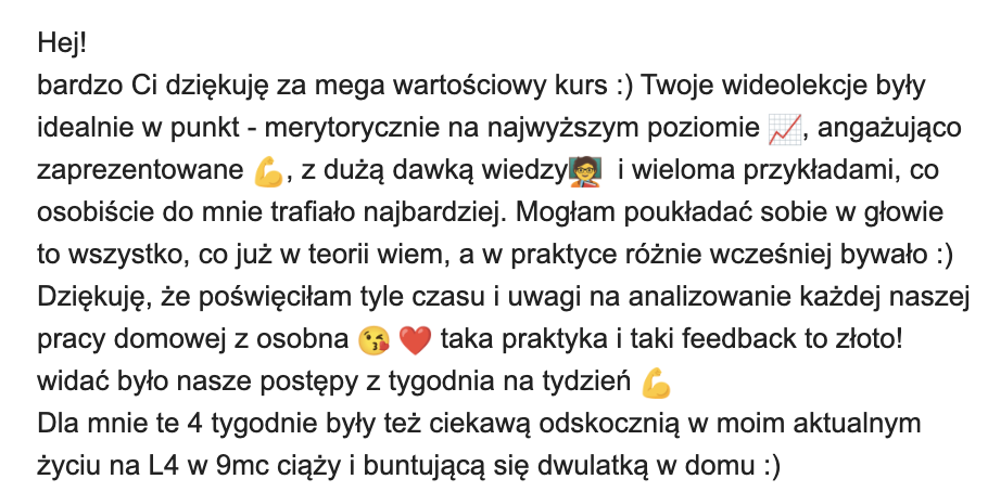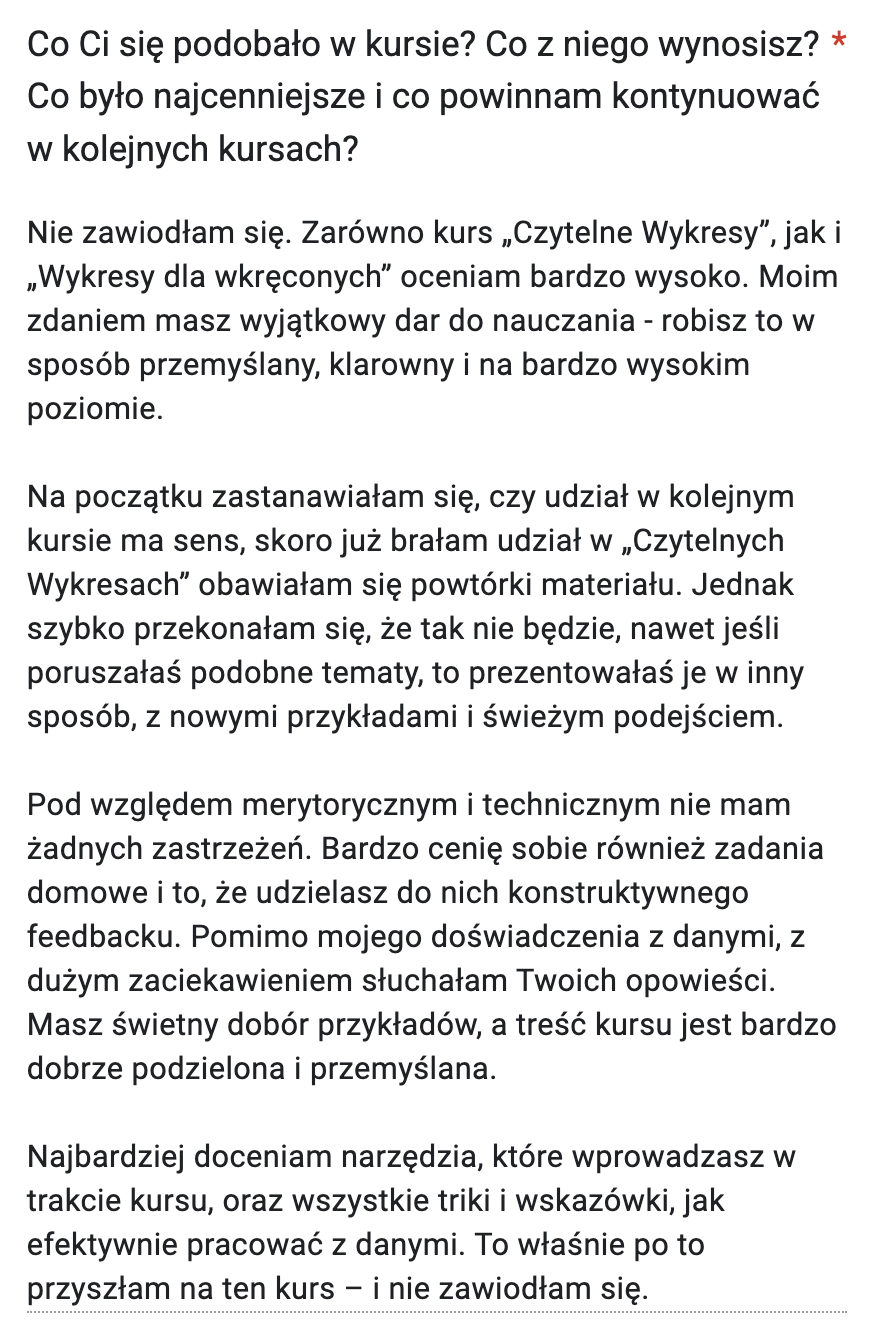 Opinie pochodzą od klientów, którzy uczestniczyli w moich kursach i szkoleniach. Opinie zbieram, weryfikuję i publikuję zgodnie z regulaminem opinii.