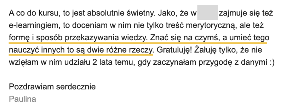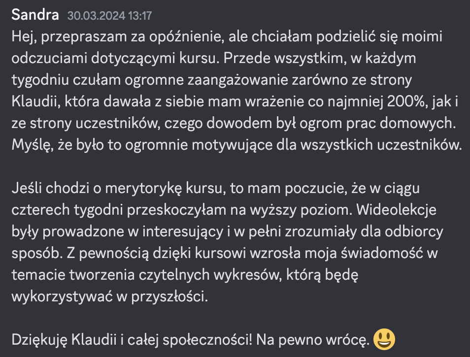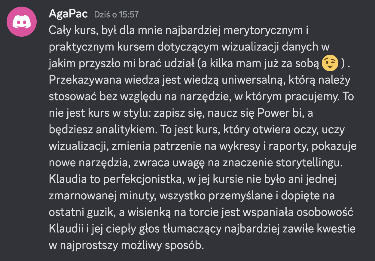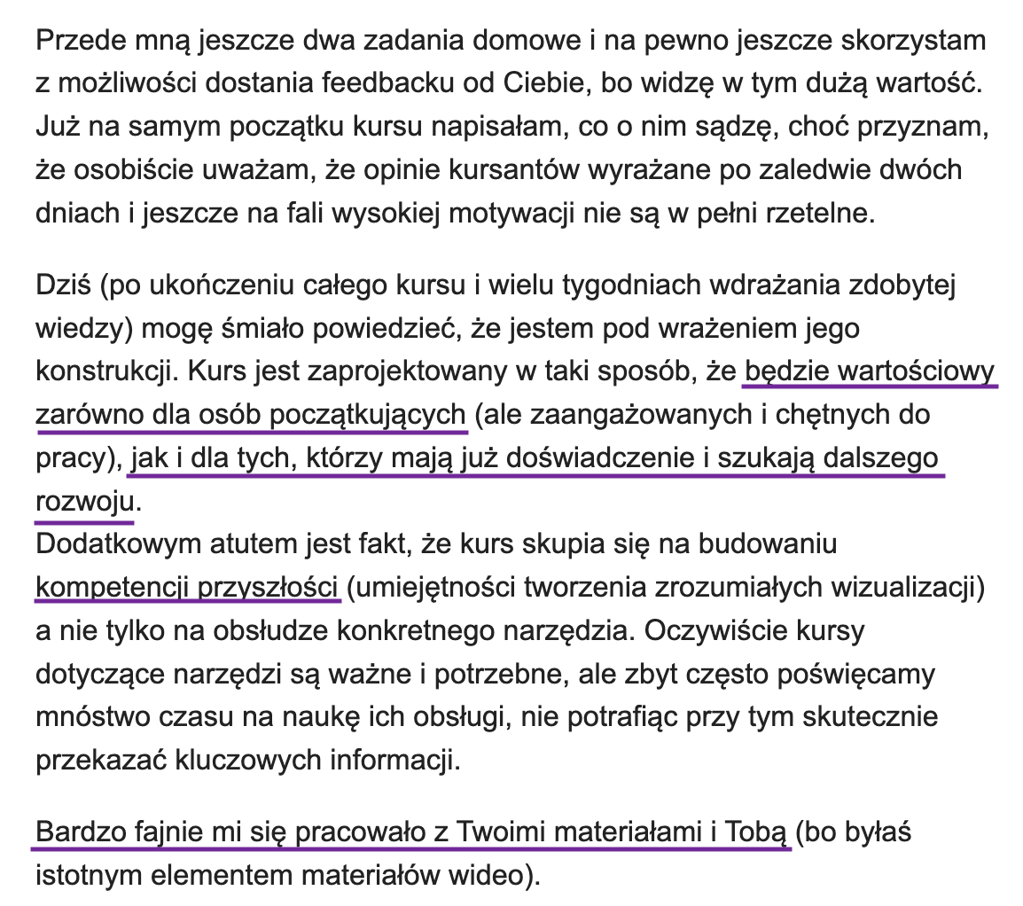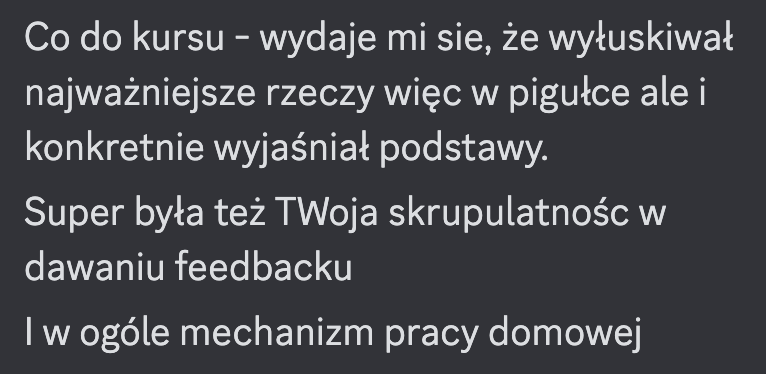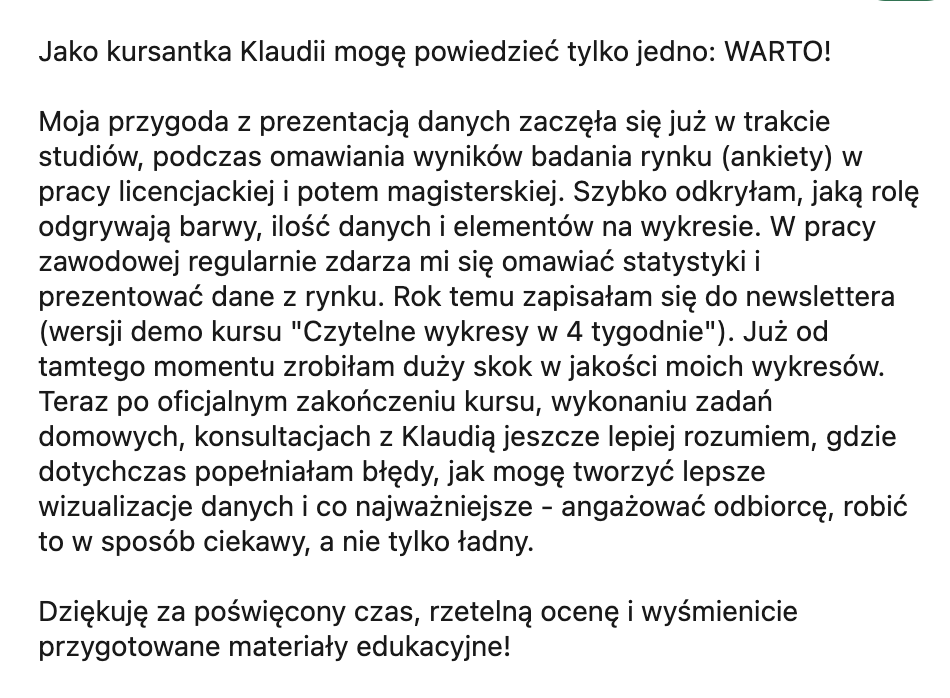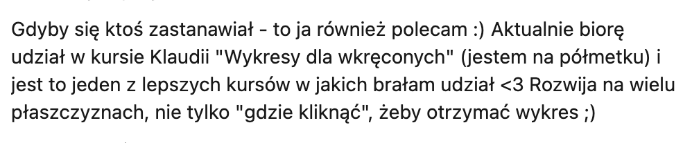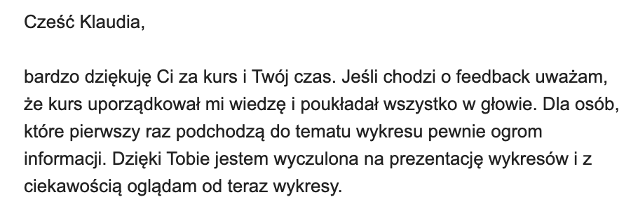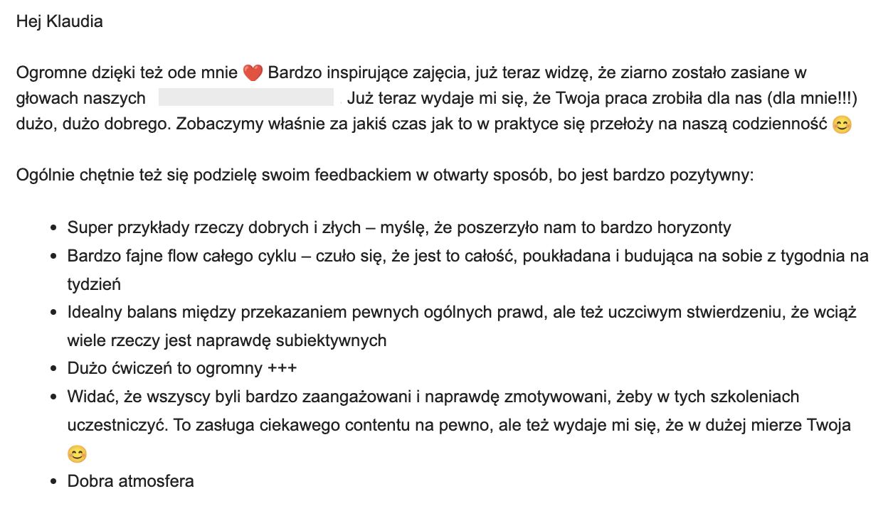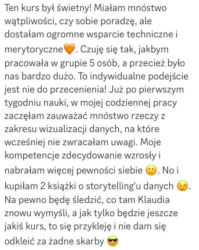 Opinie pochodzą od klientów, którzy uczestniczyli w moich kursach i szkoleniach. Opinie zbieram, weryfikuję i publikuję zgodnie z regulaminem opinii.